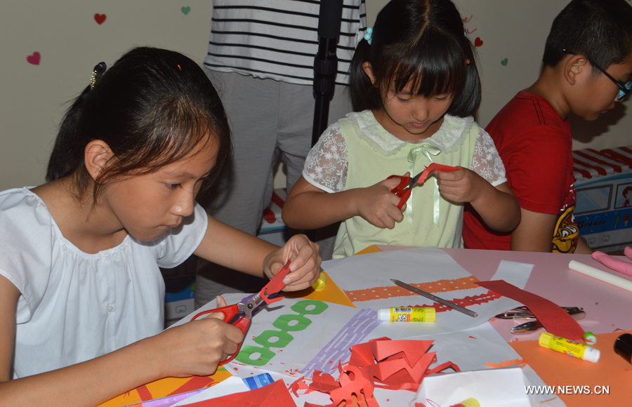 Children make paper-cutting works to greet the upcoming 9th BRICS Summit in Huli District of Xiamen City, southeast China's Fujian Province, August 4, 2017. The 9th BRICS Summit will be held on Sept. 3-5 in the coastal city. (Xinhuanet/Zhang Dan)