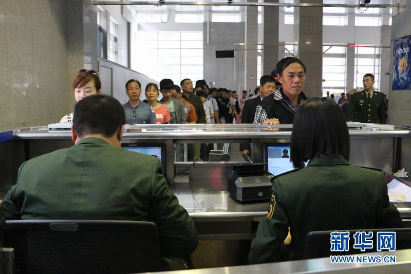 邊檢官兵正為參加廟會的旅客辦理出境手續
