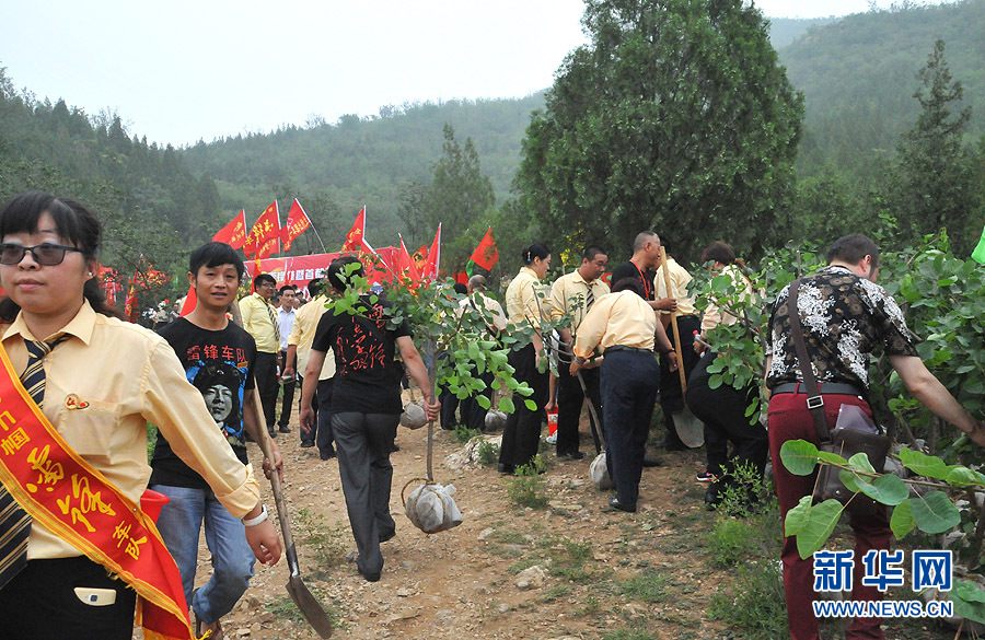 6月29日上午,來自全國各地的85支中國雷鋒出租車隊隊長、首都的士雷鋒車隊司機共200餘人匯聚北京昌平,共同建造“中國雷鋒林”。圖為的士司機們熱火朝天植樹現場。李朋芳 攝