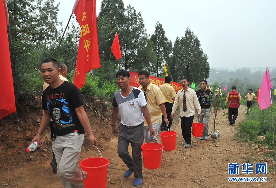 6月29日上午,來自全國各地的85支中國雷鋒出租車隊隊長、首都的士雷鋒車隊司機共200餘人匯聚北京昌平,共同建造“中國雷鋒林”。圖為的士司機們幹勁十足提水上山場景。李朋芳 攝