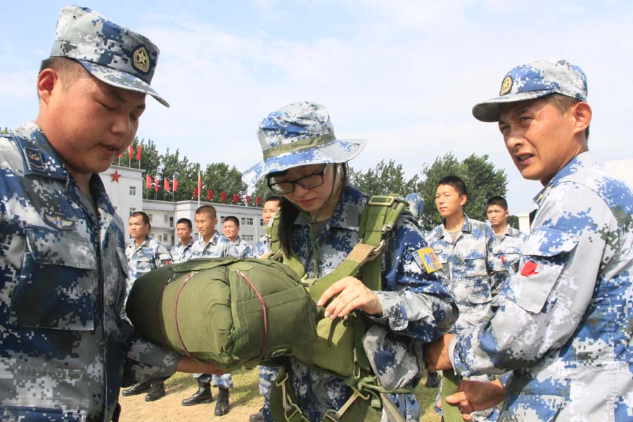 記者嘗試背上戰士們近20公斤重的傘包。彭洪霞攝