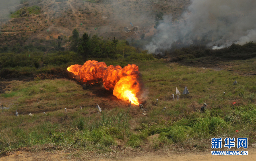 7月15日,狼牙山五壯士連舉行步兵特戰化綜合科目演練。噴火器對敵暗堡進行火焰壓制。楊茹 攝