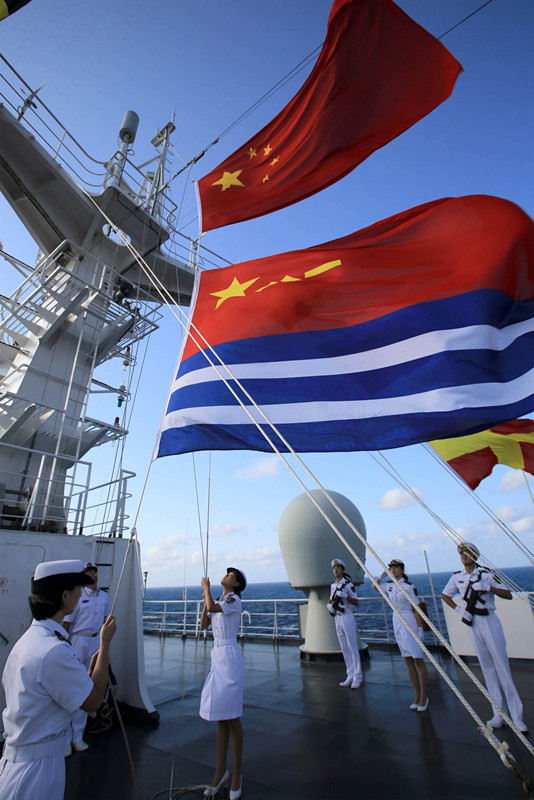 10月1日,在中國海軍和平方舟醫院船舉行的升旗儀式上,兩名信號兵緩緩升旗。江山 攝