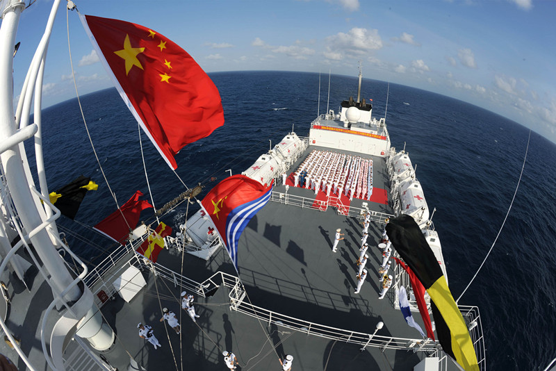 10月1日,中國海軍和平方舟醫院船在阿拉弗拉海域舉行隆重的升旗儀式,慶祝中華人民共和國成立66周年。江山 攝