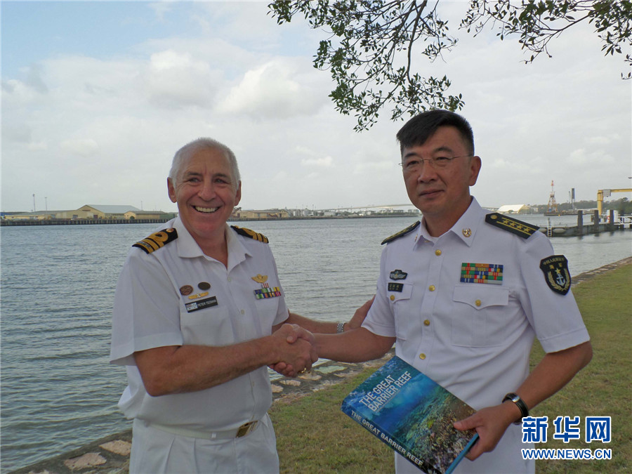 10月8日,南昆士蘭州海軍司令部司令塔德曼(左)向“和諧使命-2015”任務指揮員管柏林贈送畫冊。曹凌 攝