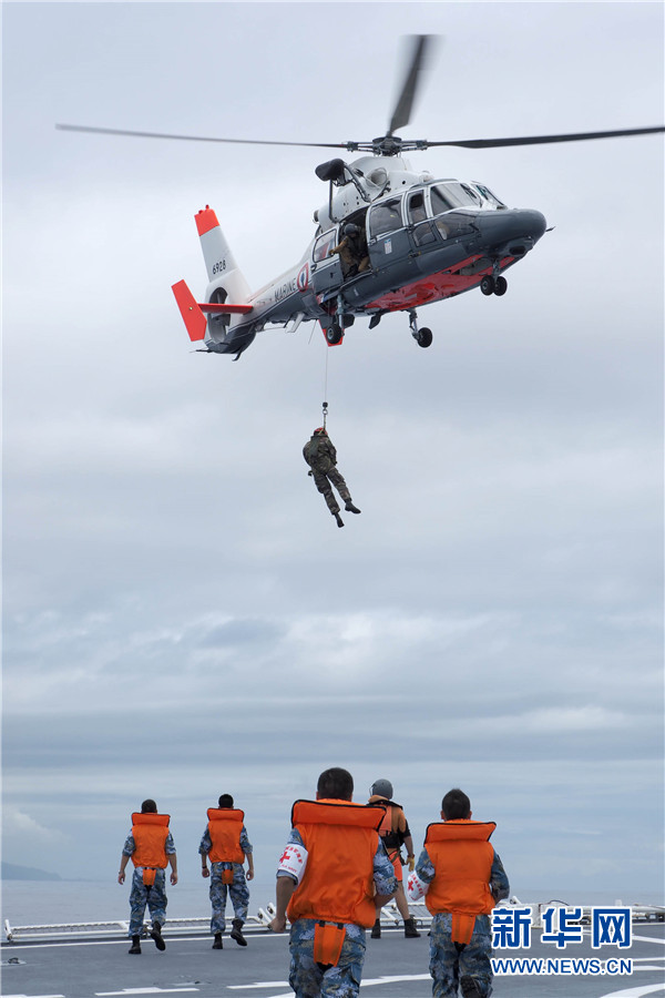 當地時間10月24日,中國海軍和平方舟醫院船首次與法軍開展國際人道主義醫療救援海上聯合演練。圖為法方直升機從中國海軍和平方舟醫院船飛行甲板吊運法軍醫護人員。江山攝