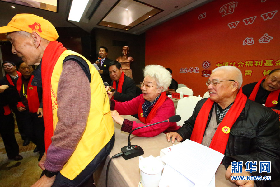 一位學雷鋒老模範請田華在自己的馬甲上簽名。新華社記者 查春明 攝