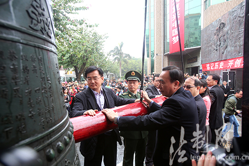 圖為參與鳴鐘的各方領導敲響警示鐘