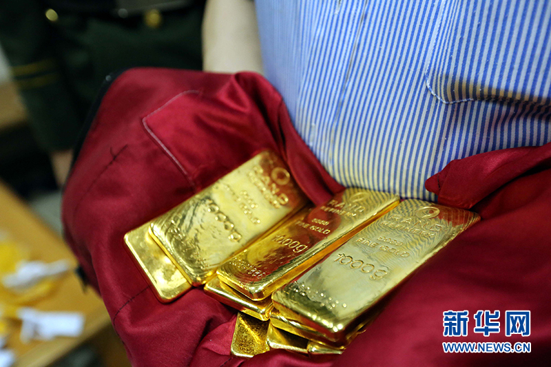 經搜身檢查發現,這名男子穿着一件特製的馬夾,馬夾內縫着10個口袋,裝着用黃色膠帶纏繞的金磚。