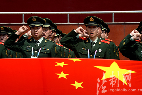 圖為唐山邊防支隊參加世園會執勤的官兵正在面向國旗莊嚴宣誓