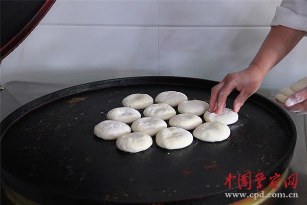 圖為面點師用電餅鐺做白皮餅。