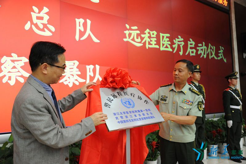“警民遠程醫療協作”啟動,浙江邊防總隊總隊長蔣建衛與浙江大學醫學院附屬第一醫院院長王偉林揭牌。