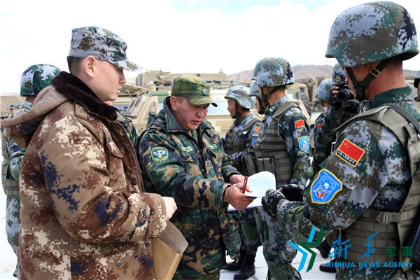 9月13日,吉爾吉斯斯坦國防軍軍官正在查驗我參演部隊官兵證件。新華社發 王寧 攝