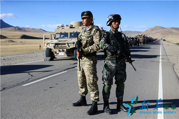 9月13日,我參演部隊士兵和吉爾吉斯斯坦國防軍士兵進行聯合警戒。新華社發 王寧 攝