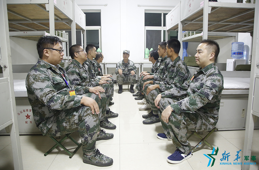 網絡名人以班為單位參加連隊班務會,講評第一天初體驗軍營生活的訓練和觀摩情況,並以“傳承長征精神,闊步強軍征程”為主題展開討論。李朋芳 攝