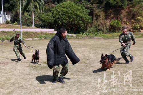 圖為警犬正在進行撲咬訓練 陸才興攝