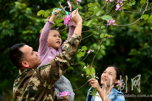 圖為來自海南的軍嫂周美娟和丈夫陳錦浪陪着女兒在營區踏青玩耍