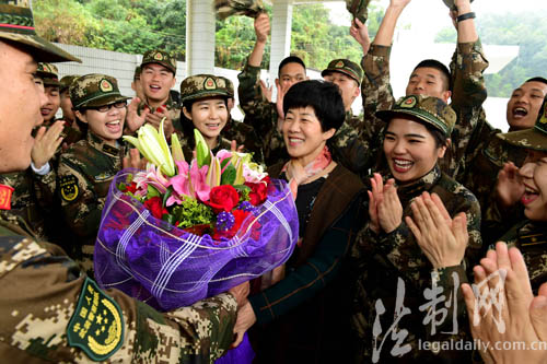 圖為官兵們向陳偉紅送上鮮花和祝福