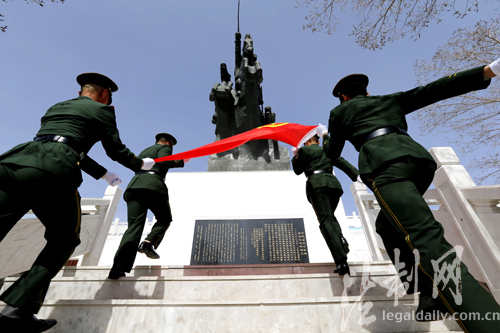 圖為機動中隊官兵緊隨團旗,緩緩走上漢白玉&階,走向紀念碑