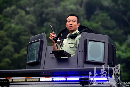 圖為一名佩戴貝雷帽的指揮員在裝甲車上