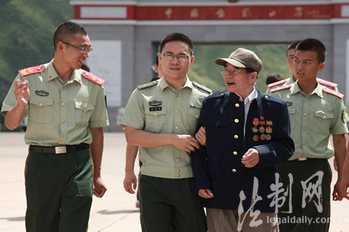 圖為解放戰爭退伍老兵對圖們邊檢站官兵進行愛國主義教育