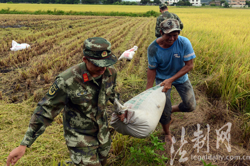 廣東中山邊防官兵走進田間地頭幫農戶搶收稻穀