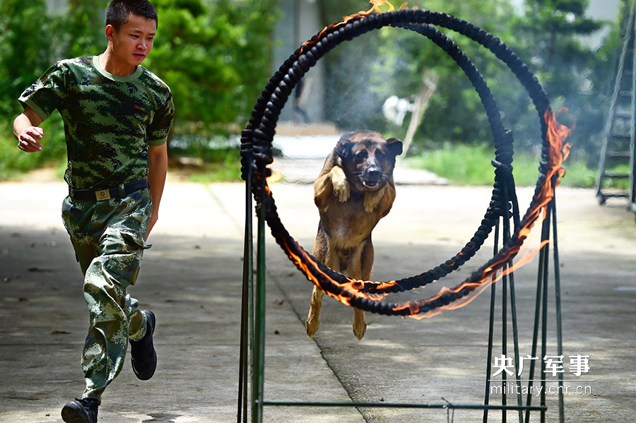 7月12日,一隻警犬在進行穿越火圈訓練。廖鍵攝