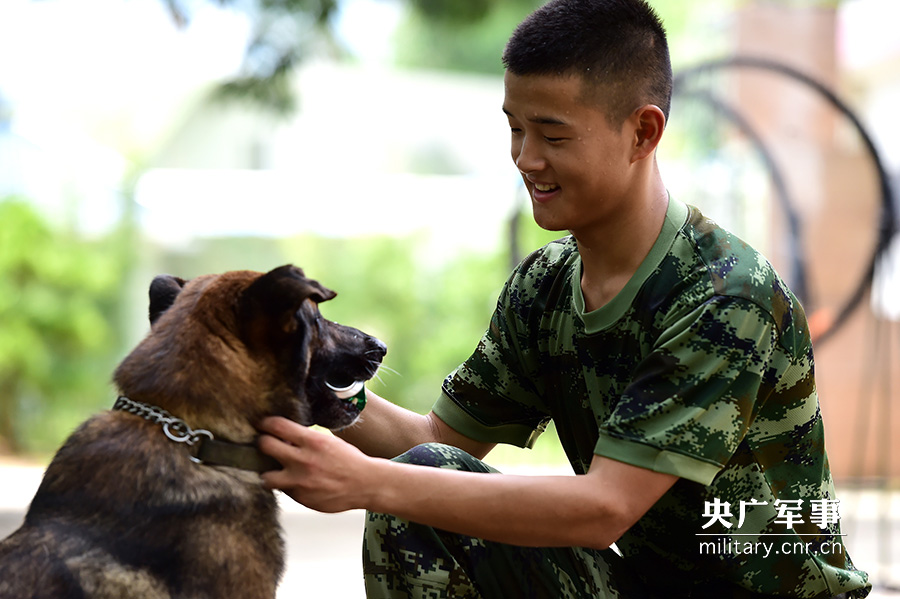 7月12日,訓練間隙,訓導員通過交流游戲,增進與警犬的情感,從而提升訓練質量。廖鍵攝