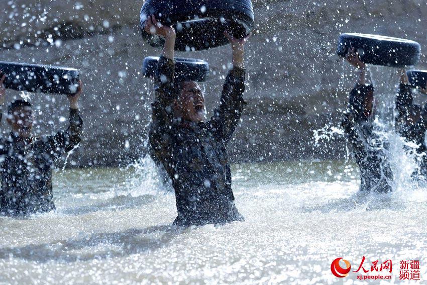 特戰隊員開展深水舉輪胎體能極限訓練。