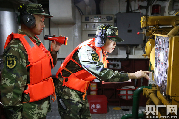汕頭邊防船艇轉港避風期間,船艇官兵在檢查機艙設備。劉建高 攝