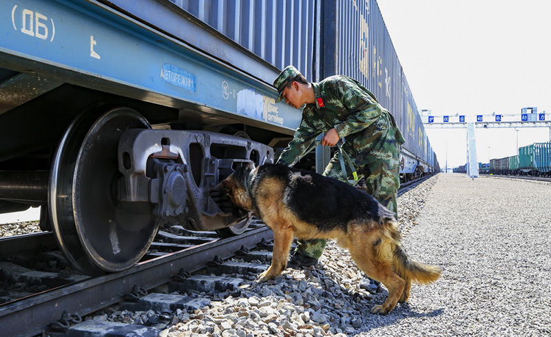 在滿洲裏鐵路貨運口岸,滿洲裏邊檢站執勤戰士正帶領警犬檢查中歐貨運列車。