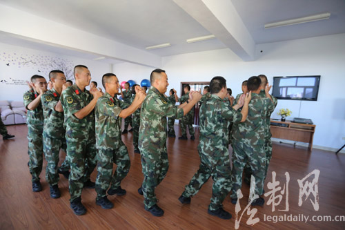為緩解官兵執勤工作壓力,確保補選退期間部隊安全,二連邊檢站國家二級心理諮詢師白晶為二連邊防大隊官兵開展了以“輕鬆來減壓”為主題的團體心理輔導。從團隊的協同配合、良性競爭、相互信任的角度出發,組織官兵開展了 “ 接龍游戲 ”“ 找零錢”“ 心有千千結 ”“表揚風暴”“戰友情深”等心理行為訓練,並採取放鬆訓練、心貼心座談等形式,充分調動官兵參與積極性,讓官兵們互相分享快樂,排解憂愁,在輕鬆歡快的氛圍中,增進了彼此感情,增加了團隊意識。上等兵張浩凱馬上面臨退伍,在“戰友情深”輔導環節,面對戰友的深情擁抱,忍不住掉下了眼淚,張浩凱動情的説:“馬上就要退伍了,捨不得朝夕相處的戰友,捨不得這身綠軍裝,我會珍惜在部隊裏的一分一秒,珍惜身邊的每一個戰友,主動站好最後一班崗。”