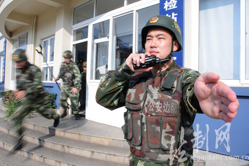 圖為邊檢官兵聽到警報快速反應