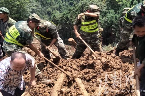 在救援官兵前往石板寨村的途中,許多路段已被山體滑坡的碎石泥土衝得垮塌了,路況十分惡劣,加之天降大雨,有的地方土質已被沖刷得非常松軟,隨時都面臨着滑坡的危險。在老兵賴江偉的帶動下,4名老兵紛紛跟上,一邊負責用手中的鐵鍬探路,一邊還不忘回頭告訴後面的戰友應該往哪走。