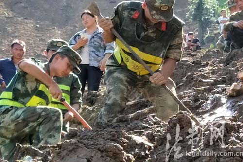 當救援分隊到達石板寨村後,映入眼簾的是一片狼藉,官兵們一個個握緊拳頭,按照之前路上的分工,分頭開始了救援工作。老兵杜崢是負責轉移受災群眾的其中一員,他平時比較內向,與戰友説話也不太多,但這次完全就像變了一個人。“大爺當心,這邊走”、“大媽小心那邊會陷進去”、“小朋友,來我牽着你走”一句句叮囑、一次次幫扶,完全看不出來他是往日那個話少內向的杜崢。