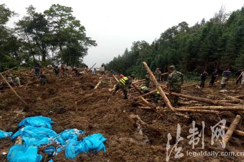 由於進入石板寨的道路塌方,大型機械無法進入,所以救援工作只有靠人力進行。邊防官兵、鄉黨政幹部、各村小組長、以及部分自發前往的群眾組織成的救援隊伍,正一鋤一鋤、一鏟一鏟的挖着。“你休息一下,讓我來” 老兵張濤一把奪過氣喘吁吁的新戰友手中的鋤頭,擼起袖子就開挖。並大聲地對旁邊的其他新戰士説:“時間就是生命,我們來救援就是為了和死神搶時間,救援時間拖延越長,埋在底下的受災群眾生還幾率就越小,大家抓緊時間呀!”