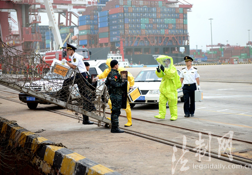 圖為黃島&&境檢驗檢疫局的工作人員登輪對核生化有害物質進行檢測
