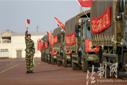 圖為江蘇邊防總隊後勤應急保障拉動演練旗語兵正在下達停車熄火的指令