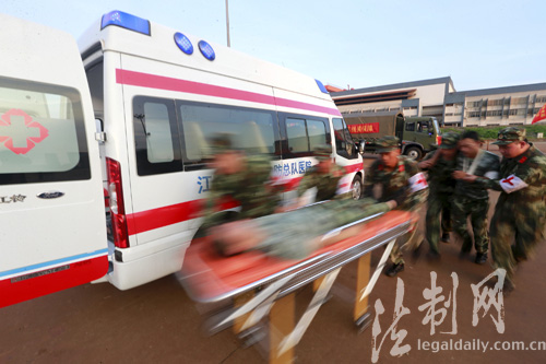 圖為江蘇邊防總隊後勤應急保障拉動演練醫護人員緊轉移護傷員