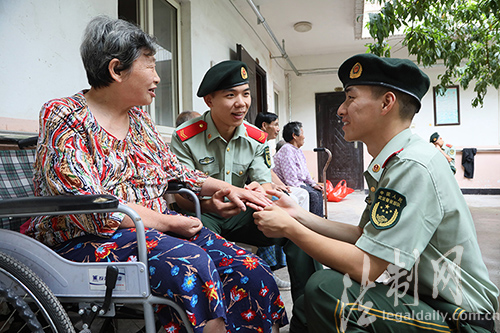 8月29日下午,江蘇邊防總隊連雲港邊檢站面臨復退的戰士最後一次穿着軍裝走進駐地敬老院,看望他們“認親”的老人,送上他們退伍前的一聲祝福,並將“認親”的老人交到留隊的戰友手中,將這份愛心傳遞下去。據悉,這個站“認親”的傳統已經延續了27年,每名官兵都有“認親”的孤寡老人,他們和老人之間建立了深厚的感情。(錢逸帆 王鈺)