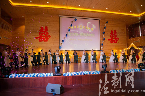 在浪漫歡慶的氛圍中,20對新人相互挽着臂膀逐次走上地毯,邁上舞&,大聲説出了自己的愛情宣言。婚禮整個過程契合主題,尊重傳統並結合部隊當前面臨的任務、環境,設置了集體求婚、交換信物、領導致辭、新人代表講話、感恩父母、警嫂感言、互動娛樂等環節。當新郎集體喊出“我愛你,嫁給我吧”,場面神聖而震撼,新娘回答“我願意”,場面溫馨而幸福,領導致辭充滿了對新人的祝福和期望,新郎、新娘代表講話表達了對部隊、父母、親朋的感謝及婚後的工作生活方向,新人代表父母在感恩環節流下了感動的淚水,一名轉業幹部家屬以11年警嫂生涯中的點點滴滴搭配一首詩歌詮釋了軍人家庭的苦與樂,獨守與幸福,闡述了對部隊的懷念和祝福,部隊歌手的獻藝和新人的游戲互動更是將典禮帶入了掌聲的長河、笑聲的海洋。典禮的尾聲,來賓與新人在秀麗的輝河之畔合影並放飛和平鴿,象徵着和平與友誼世代長青、萬古留存。