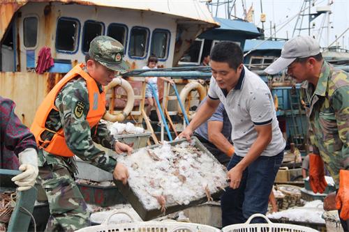 圖為東山陳城邊防派出所官兵幫助漁民搶運海産品