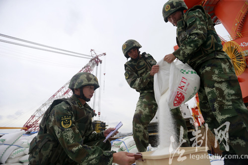 圖為鹽城邊防支隊官兵對涉嫌船舶上的白糖進行取樣備查