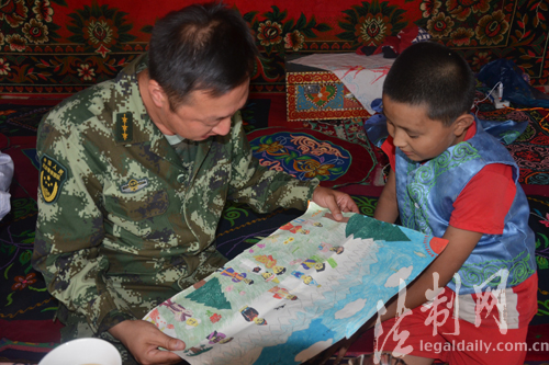 圖為“親戚”的兒子向邊防官兵展示自己的畫作