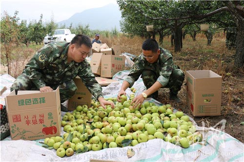 圖為官兵將採摘好的蘋果梨裝箱準備分發給轄區困難群眾