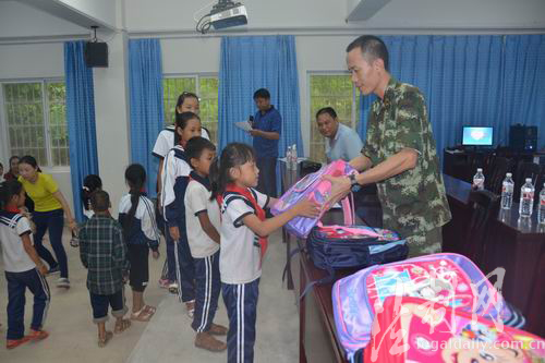 圖為官兵正將捐贈的書包遞交到學生手中