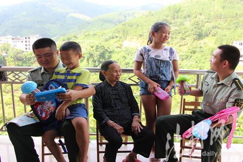 圖為邊防官兵給小欣怡姐弟送去玩具