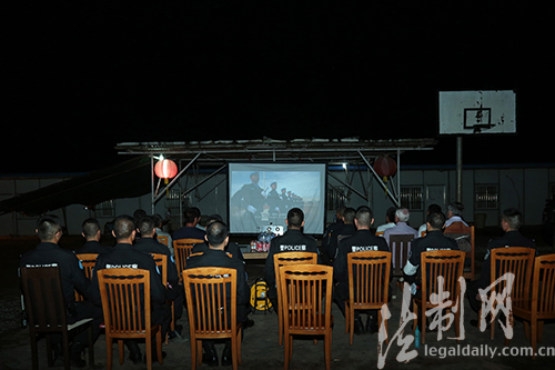圖為中國維和警察防暴隊與當地中資企業員工共同觀看愛國主義教育影片