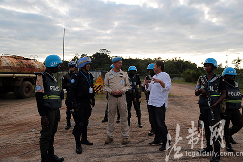圖為中國維和警察防暴隊與聯利團防暴辦主任尼日利亞防暴隊向當地中資企業負責人了解治安情況