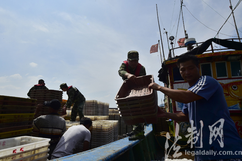 圖為在福建省寧德市蕉城區三都澳養殖區,邊防官兵幫助漁民轉移餌料冰盤